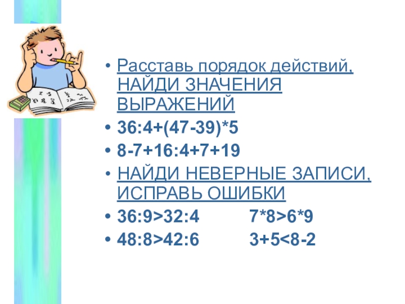 Расставь порядок действий, НАЙДИ ЗНАЧЕНИЯ ВЫРАЖЕНИЙ36:4+(47-39)*58-7+16:4+7+19НАЙДИ НЕВЕРНЫЕ ЗАПИСИ, ИСПРАВЬ ОШИБКИ36:9>32:4     7*8>6*948:8>42:6
