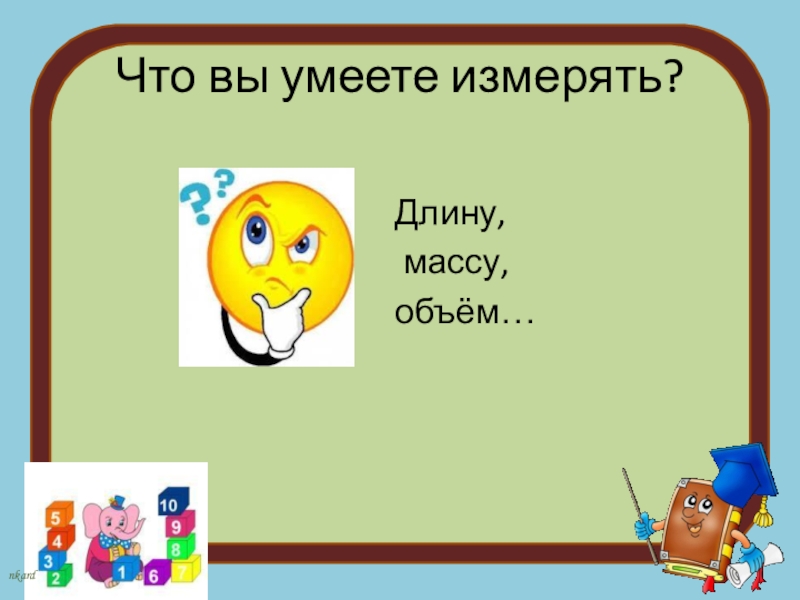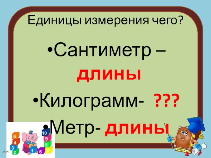 Единицы измерения чего?Сантиметр – длиныКилограмм- ???Метр- длины