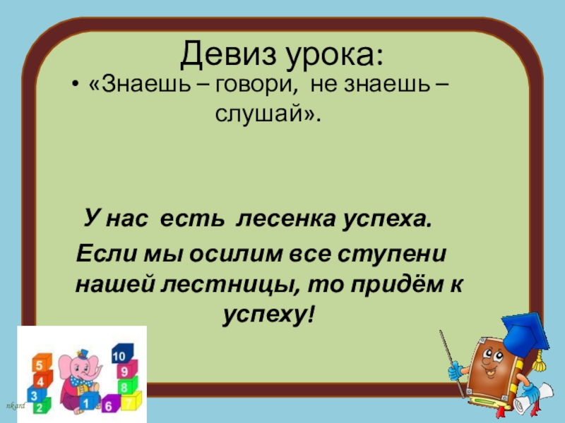 Девиз урока: «Знаешь – говори, не знаешь – слушай».У нас есть лесенка успеха. Если мы осилим все