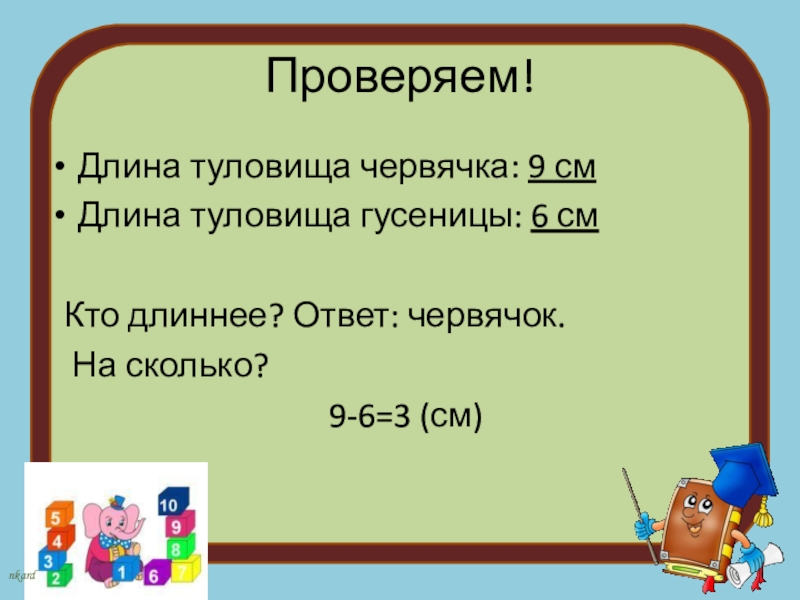 Проверяем!Длина туловища червячка: 9 смДлина туловища гусеницы: 6 см   Кто длиннее? Ответ: червячок.  На