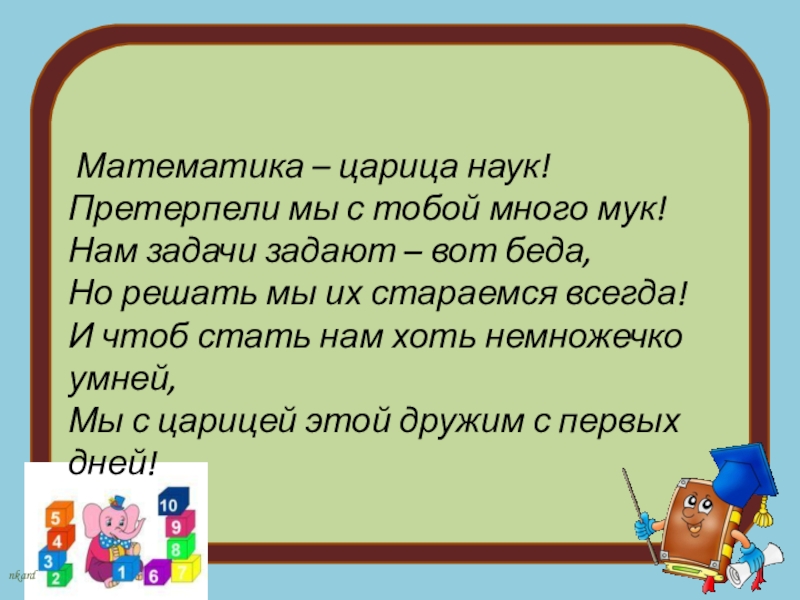 Математика – царица наук! Претерпели мы с тобой много мук! Нам задачи задают – вот беда, Но решать мы их стараемся всегда! И чтоб стать нам хоть немножечко