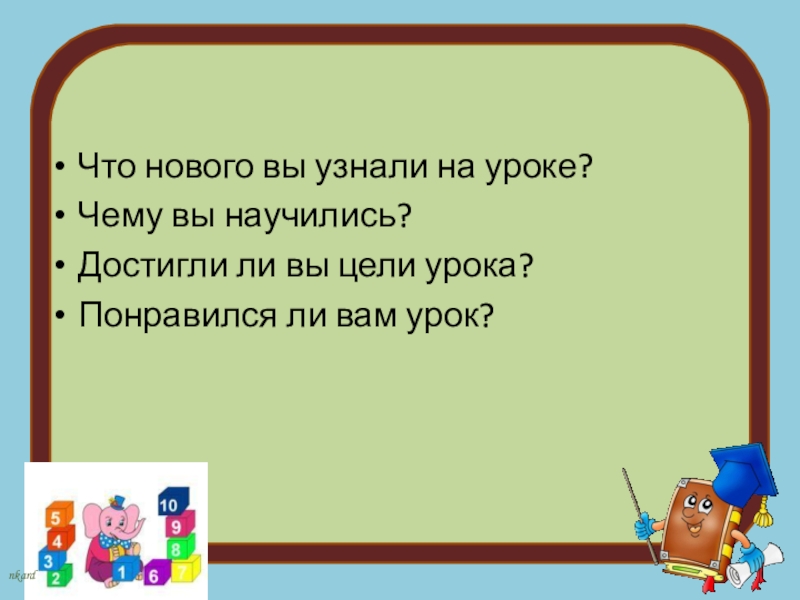 Что нового вы узнали на уроке?Чему вы научились?Достигли ли вы цели урока?Понравился ли вам урок?