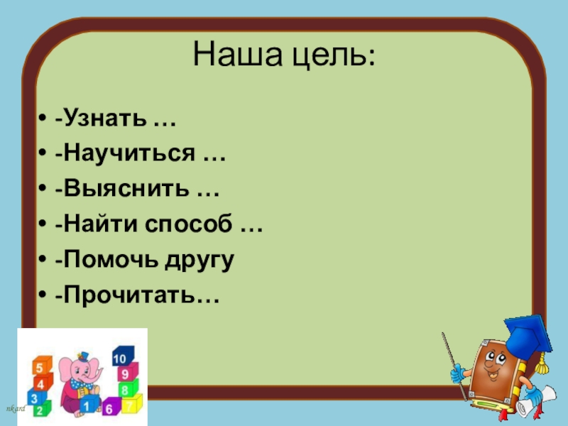 Наша цель:-Узнать …-Научиться …-Выяснить …-Найти способ …-Помочь другу-Прочитать…