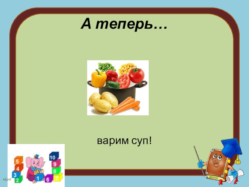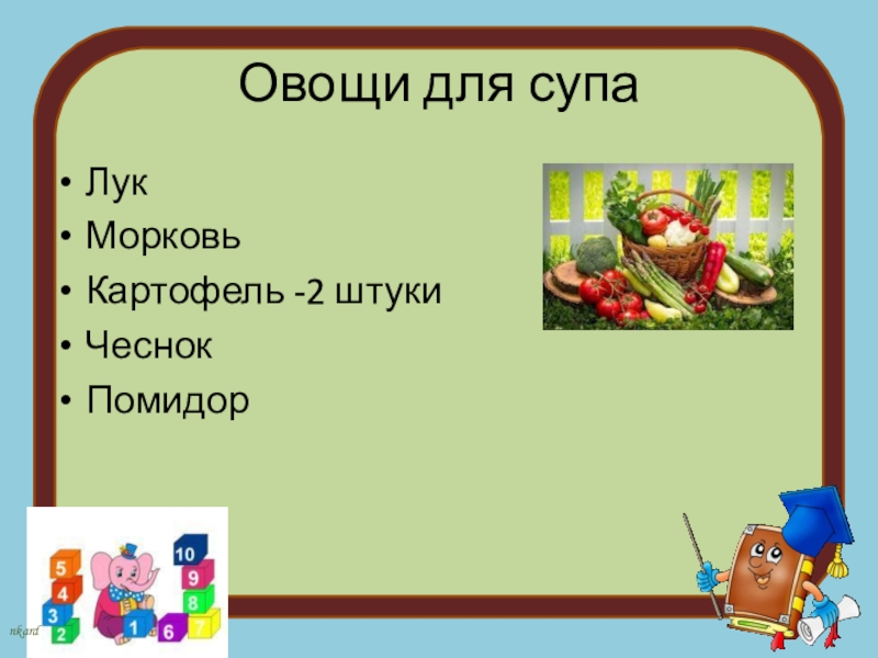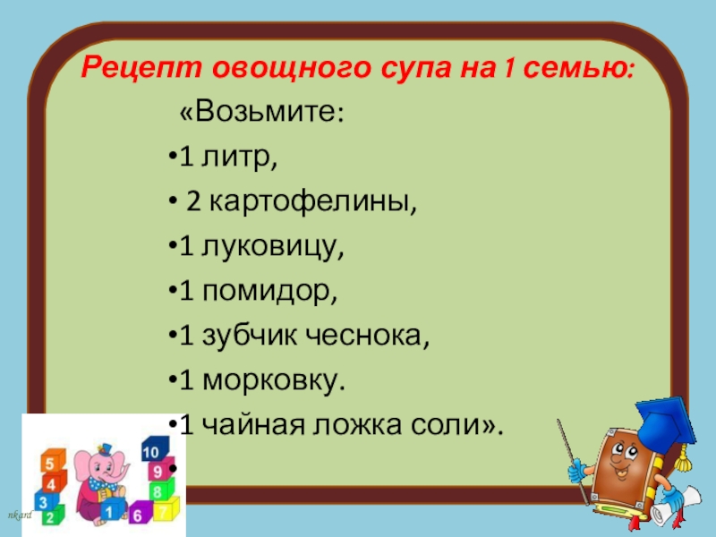 Рецепт овощного супа на 1 семью:«Возьмите:1 литр, 2 картофелины, 1 луковицу, 1 помидор,1 зубчик чеснока,1 морковку.1 чайная