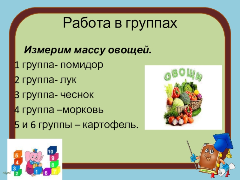 Работа в группах Измерим массу овощей.1 группа- помидор2 группа- лук3 группа- чеснок4 группа –морковь5 и 6 группы