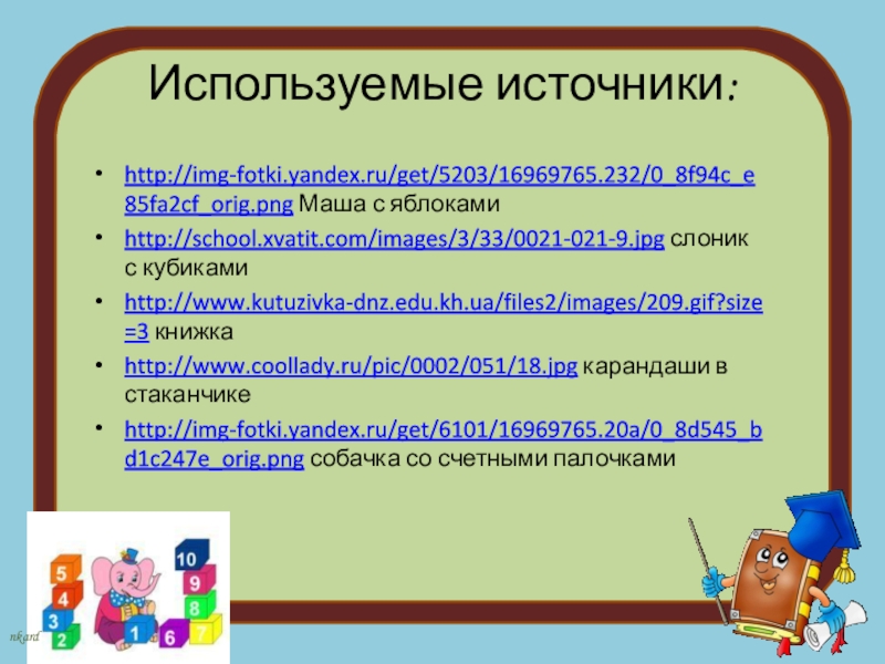 Используемые источники:http://img-fotki.yandex.ru/get/5203/16969765.232/0_8f94c_e85fa2cf_orig.png Маша с яблокамиhttp://school.xvatit.com/images/3/33/0021-021-9.jpg слоник с кубикамиhttp://www.kutuzivka-dnz.edu.kh.ua/files2/images/209.gif?size=3 книжкаhttp://www.coollady.ru/pic/0002/051/18.jpg карандаши в стаканчикеhttp://img-fotki.yandex.ru/get/6101/16969765.20a/0_8d545_bd1c247e_orig.png собачка со счетными палочками