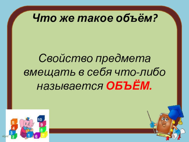 Что же такое объём?Свойство предмета вмещать в себя что-либо называется ОБЪЁМ.