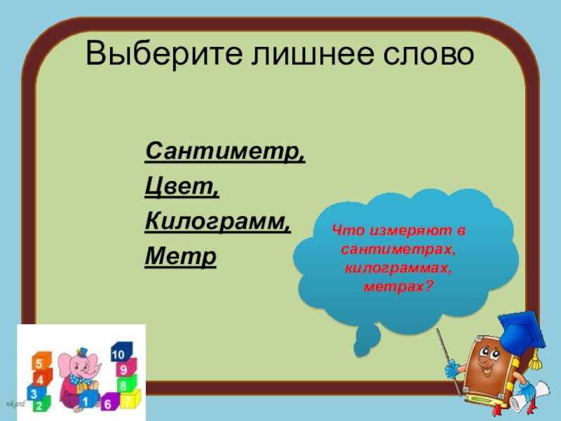 Выберите лишнее слово Сантиметр,Цвет,Килограмм,Метр Что измеряют в сантиметрах, килограммах, метрах?