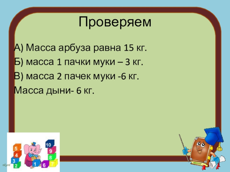 Проверяем А) Масса арбуза равна 15 кг.Б) масса 1 пачки муки – 3 кг.В) масса 2 пачек