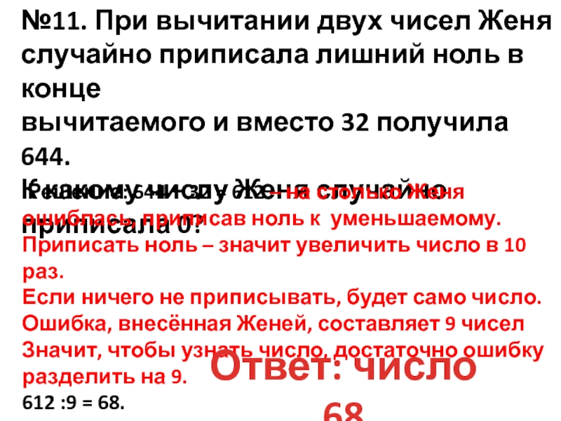 Решение: 644 − 32 = 612 – на столько Женя ошиблась, приписав ноль к уменьшаемому.