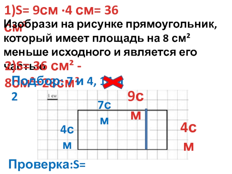 Проверка:S= 7см²·4см²=28см²
