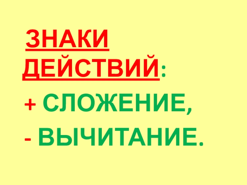 ЗНАКИ ДЕЙСТВИЙ: + СЛОЖЕНИЕ, - ВЫЧИТАНИЕ.
