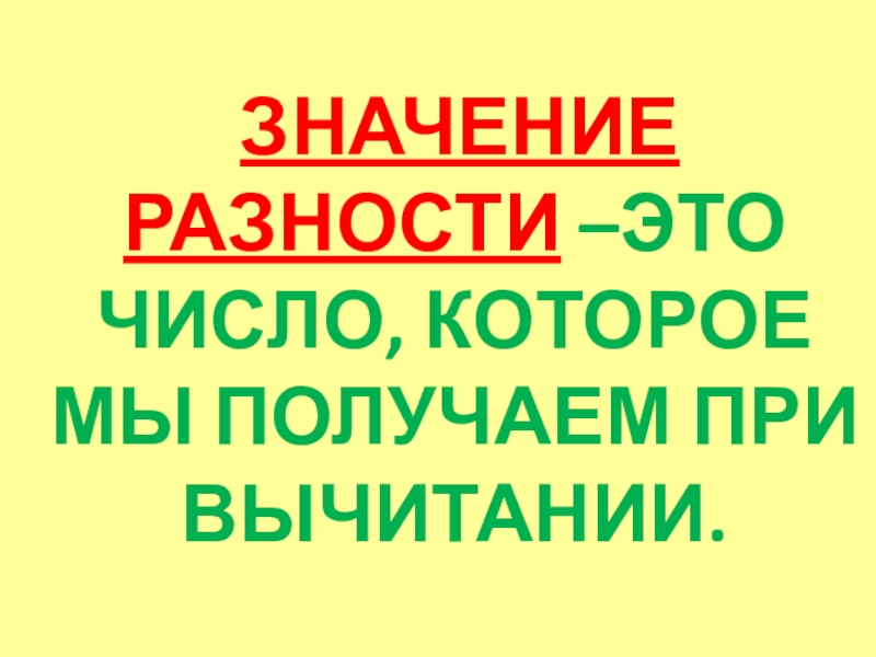 ЗНАЧЕНИЕ РАЗНОСТИ –ЭТО ЧИСЛО, КОТОРОЕ МЫ ПОЛУЧАЕМ ПРИ ВЫЧИТАНИИ.