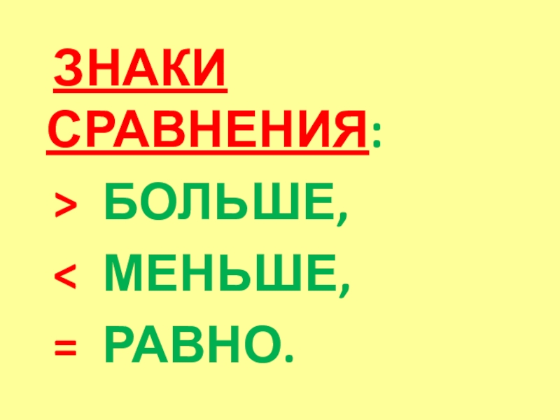 ЗНАКИ СРАВНЕНИЯ:	> БОЛЬШЕ,	< МЕНЬШЕ,	= РАВНО.