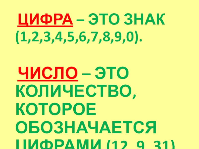 ЦИФРА – ЭТО ЗНАК (1,2,3,4,5,6,7,8,9,0).	ЧИСЛО – ЭТО КОЛИЧЕСТВО, КОТОРОЕ ОБОЗНАЧАЕТСЯ ЦИФРАМИ (12, 9, 31).