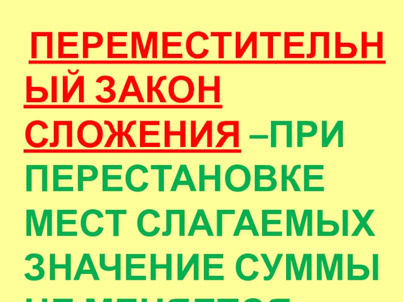 ПЕРЕМЕСТИТЕЛЬНЫЙ ЗАКОН СЛОЖЕНИЯ –ПРИ ПЕРЕСТАНОВКЕ МЕСТ СЛАГАЕМЫХ ЗНАЧЕНИЕ СУММЫ НЕ МЕНЯЕТСЯ.
