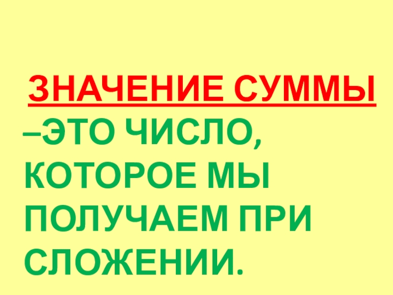 ЗНАЧЕНИЕ СУММЫ –ЭТО ЧИСЛО, КОТОРОЕ МЫ ПОЛУЧАЕМ ПРИ СЛОЖЕНИИ.