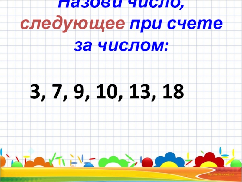 Назови число, следующее при счете за числом:    3, 7, 9, 10, 13, 18