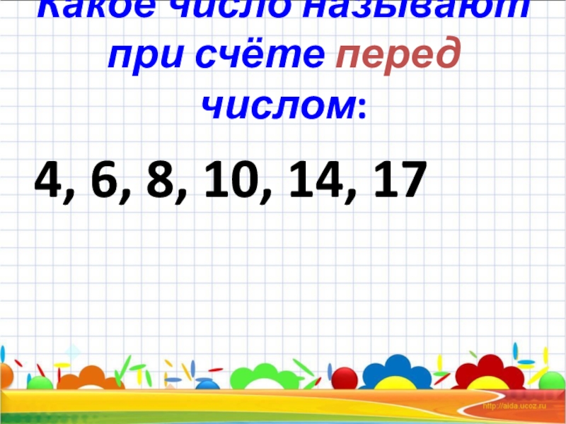 Какое число называют при счёте перед числом:4, 6, 8, 10, 14, 17