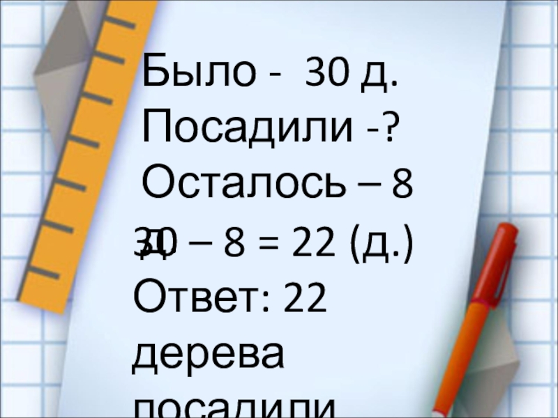 Было - 30 д.Посадили -?Осталось – 8 д.30 – 8 = 22 (д.)Ответ: 22 деревапосадили.