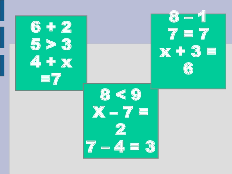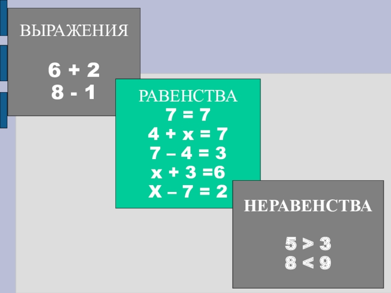 ВЫРАЖЕНИЯ6 + 28 - 1РАВЕНСТВА7 = 74 + x = 77 – 4 = 3x + 3