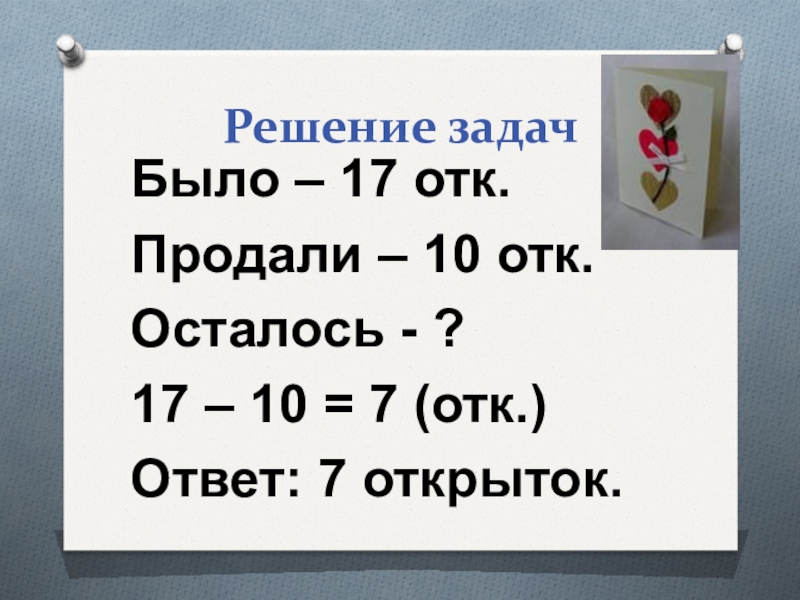 Решение задачБыло – 17 отк.Продали – 10 отк.Осталось - ?17 – 10 = 7 (отк.)Ответ: 7 открыток.