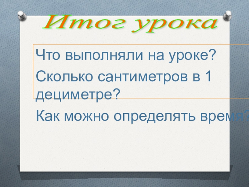 Что выполняли на уроке?Сколько сантиметров в 1 дециметре?Как можно определять время?Итог урока