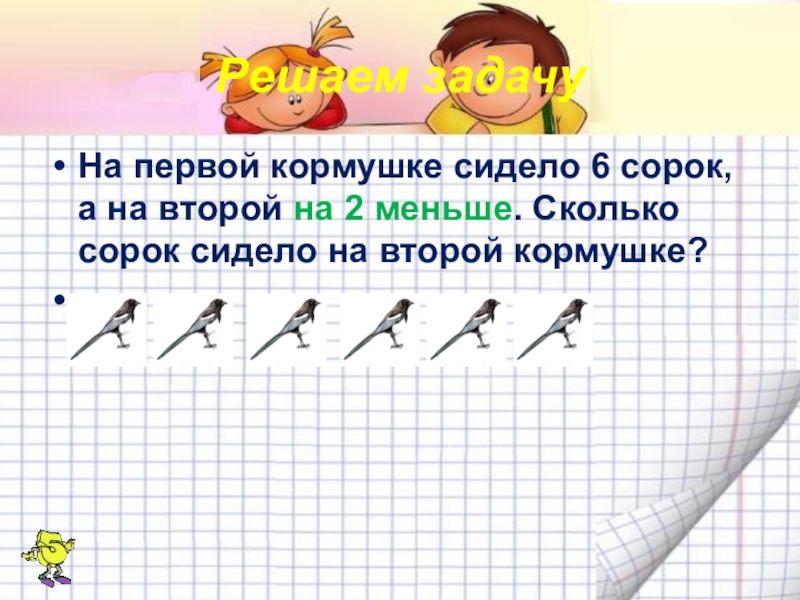 Решаем задачуНа первой кормушке сидело 6 сорок, а на второй на 2 меньше. Сколько сорок сидело на