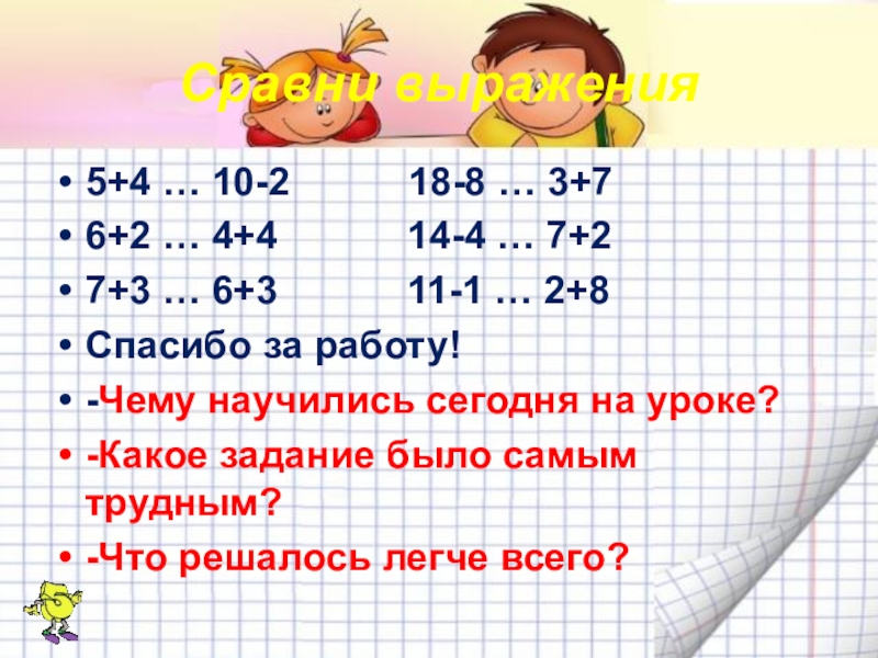 Сравни выражения5+4 … 10-2      18-8 … 3+76+2 … 4+4
