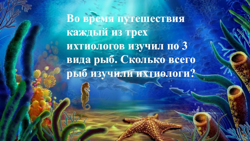 Слайд 18Во время путешествия каждый из трех ихтиологов изучил по 3 вида