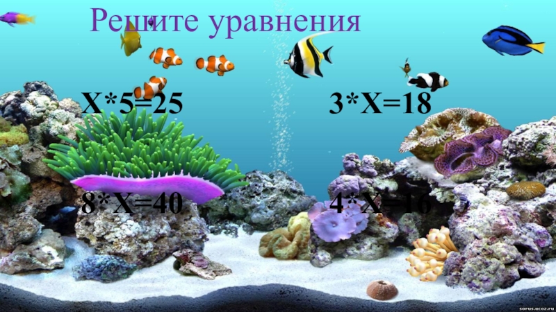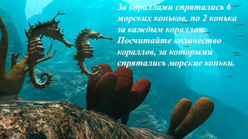 Слайд 11За кораллами спрятались 6 морских коньков, по 2 конька за каждым
