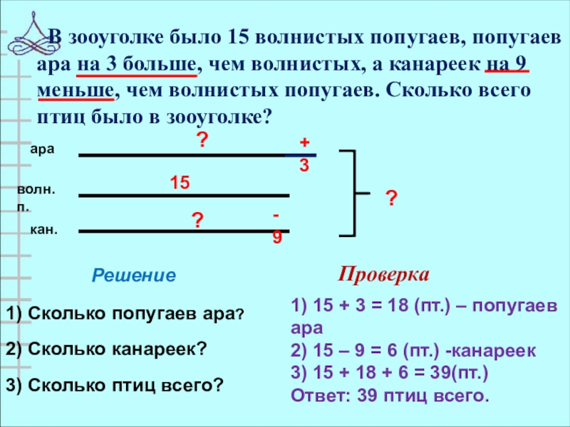 1) 15 + 3 = 18 (пт.) – попугаев ара
