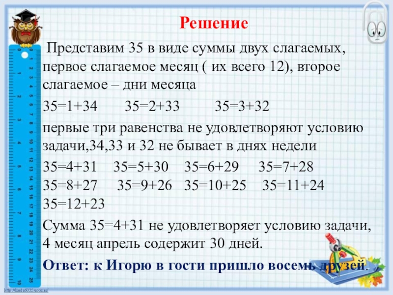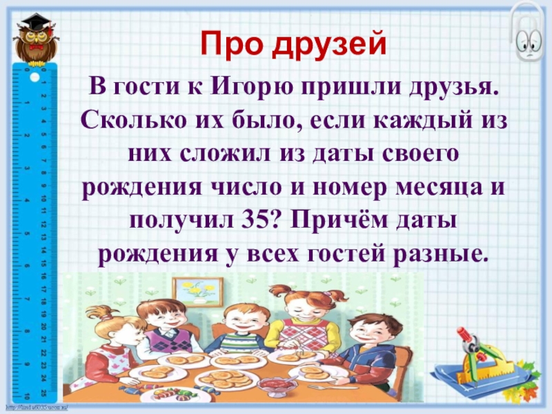каждый из них сложил из даты своего рождения число и номер месяца и получил 35? Причём даты рождения у всех гостей разные.