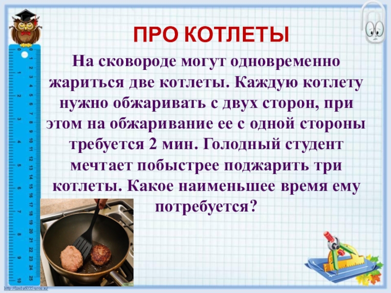 обжаривать с двух сторон, при этом на обжаривание ее с одной стороны требуется 2 мин. Голодный студент мечтает побыстрее поджарить три котлеты. Какое наименьшее время ему потребуется?