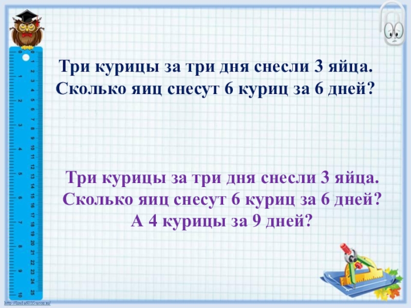 Три курицы за три дня снесли 3 яйца. Сколько яиц снесут 6 куриц за 6 дней? А 4 курицы за 9 дней?