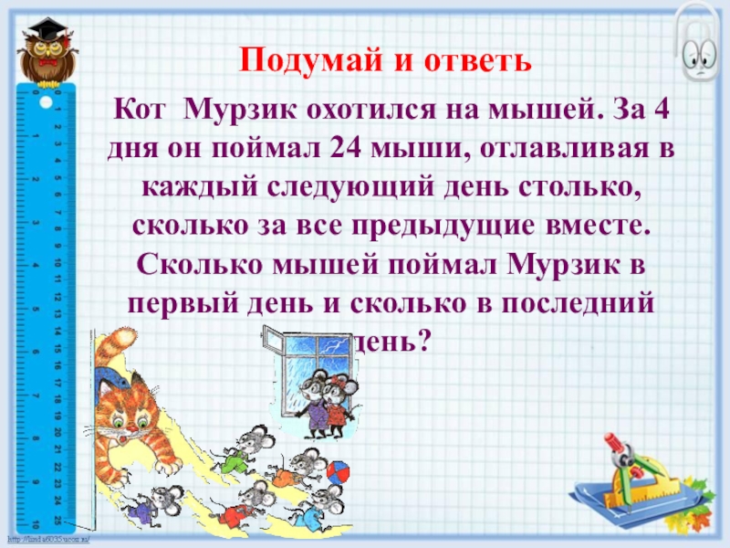 Кот Мурзик охотился на мышей. За 4 дня он