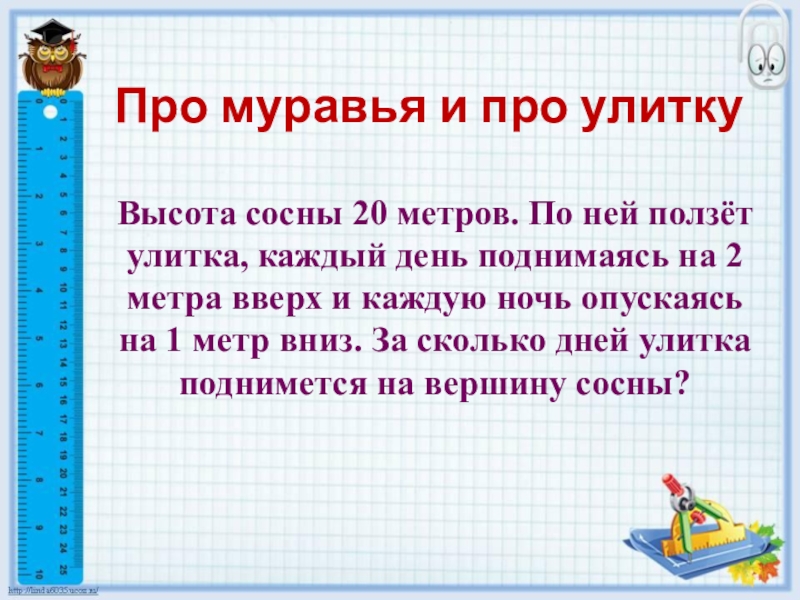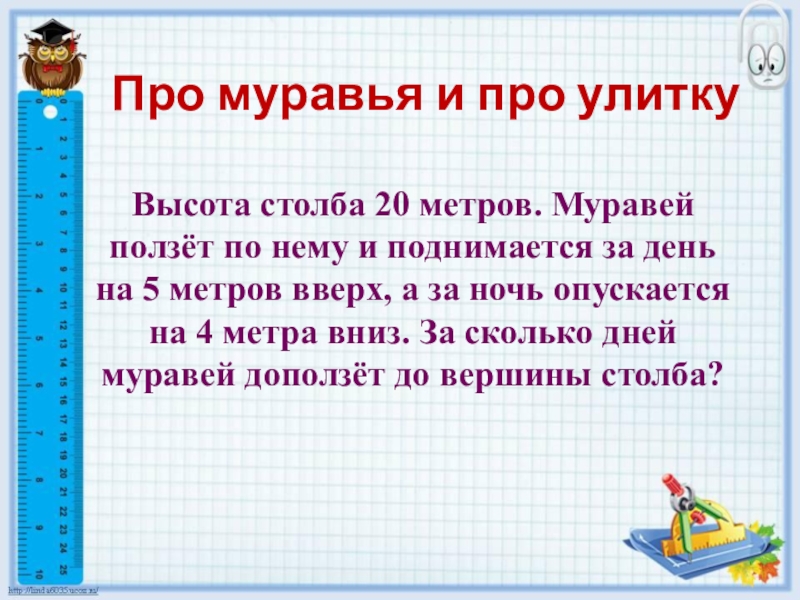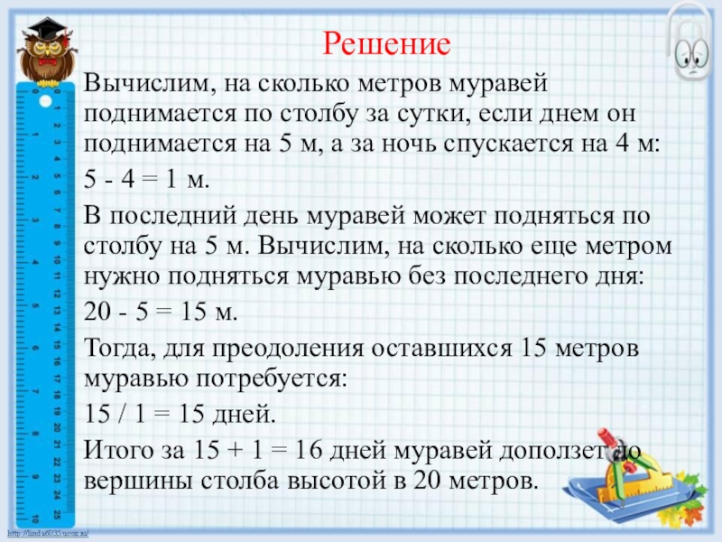 нему и поднимается за день на 5 метров вверх, а за ночь опускается на 4 метра вниз. За сколько дней муравей доползёт до вершины столба?