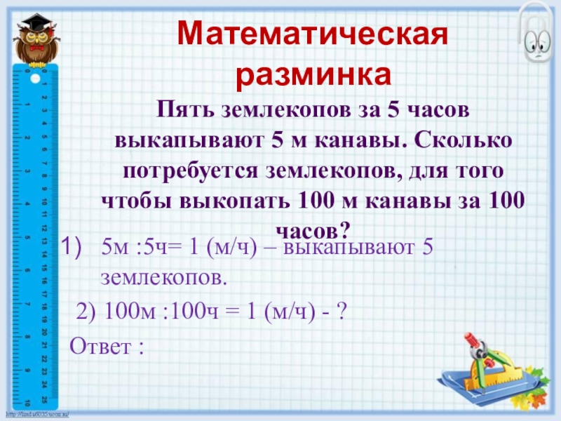 5м :5ч= 1 (м/ч) – выкапывают 5 землекопов.