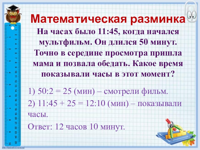 На часах было 11:45, когда начался мультфильм. Он длился 50