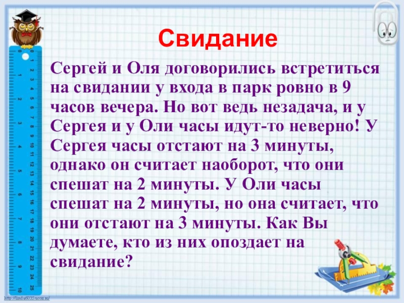 ровно в 9 часов вечера. Но вот ведь незадача, и у Сергея и у Оли часы идут-то неверно! У Сергея часы отстают на 3 минуты, однако он считает наоборот, что они спешат на 2 минуты. У Оли часы спешат на 2 минуты, но она считает, что они отстают на 3 минуты. Как Вы думаете, кто из них опоздает на свидание?