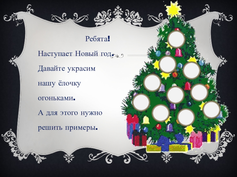 Ребята! Наступает Новый год.Давайте украсим нашу ёлочкуогоньками. А для этого нужно решить примеры.