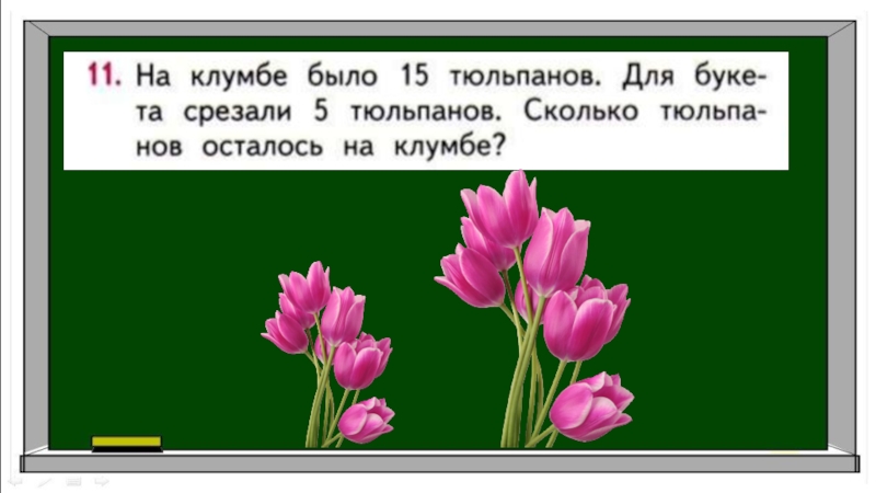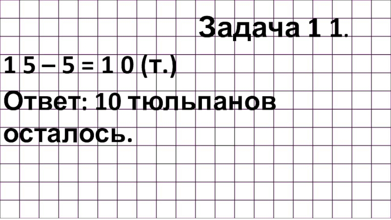 Задача 1 1.1 5 – 5 = 1 0 (т.)Ответ: 10 тюльпанов осталось.