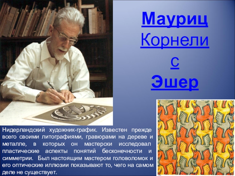 Мауриц Корнелис ЭшерНидерландский художник-график. Известен прежде всего своими литографиями, гравюрами на дереве и металле, в которых он мастерски исследовал пластические аспекты понятий бесконечности и симметрии. Был настоящим мастером головоломок и его оптические иллюзии показывают то, чего на самом
