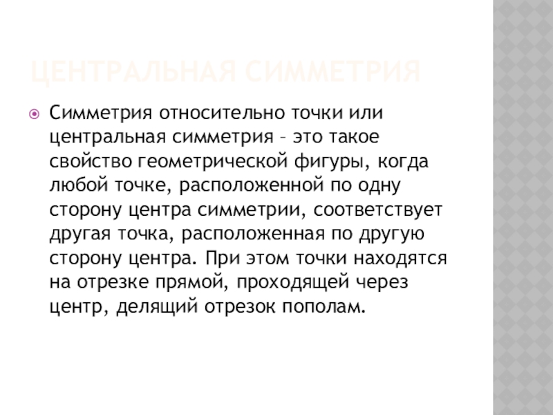 геометрической фигуры, когда любой точке, расположенной по одну сторону центра симметрии, соответствует другая точка, расположенная по другую сторону центра. При этом точки находятся на отрезке прямой, проходящей через центр, делящий отрезок пополам.