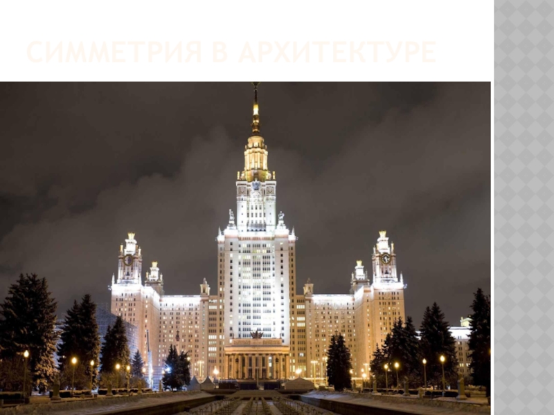 красоту, соразмерность, пропорциональность, одинаковость в расположении частей. Издавна человек использовал симметрию в архитектуре. Древним храмам, башням средневековых замков, современным зданиям она придает гармоничность, законченность.
