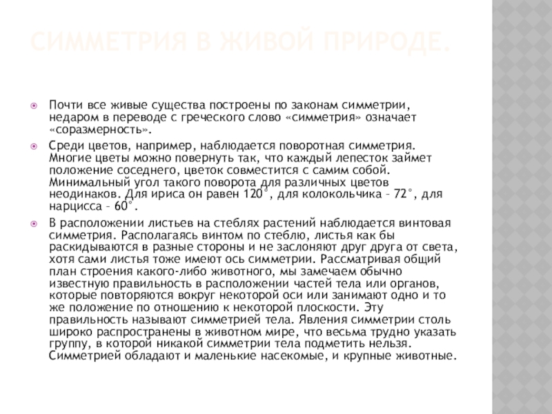 Среди цветов, например, наблюдается поворотная симметрия. Многие цветы можно повернуть так, что каждый лепесток займет положение соседнего, цветок совместится с самим собой. Минимальный угол такого поворота для различных цветов неодинаков. Для ириса он равен 120°, для колокольчика – 72°, для нарцисса – 60°.