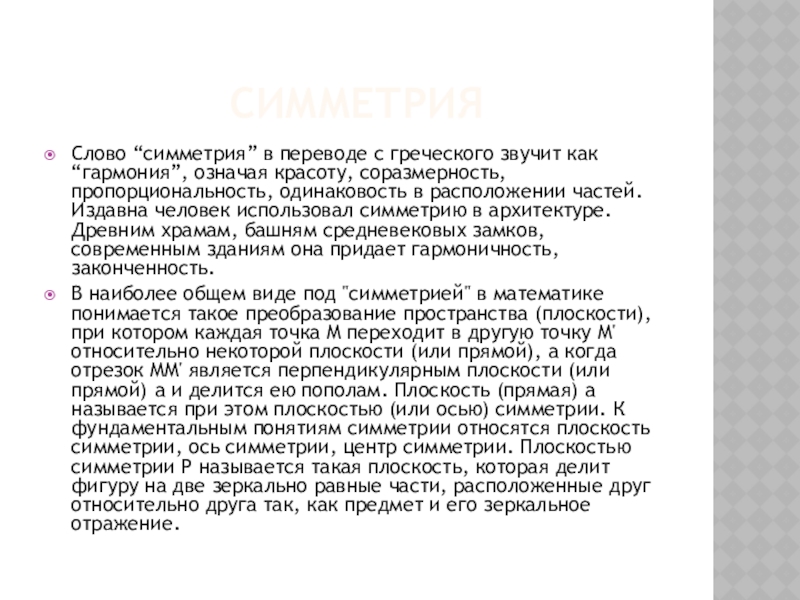 Симметрия Слово “симметрия” в переводе с греческого звучит как “гармония”, означая красоту, соразмерность, пропорциональность, одинаковость в расположении