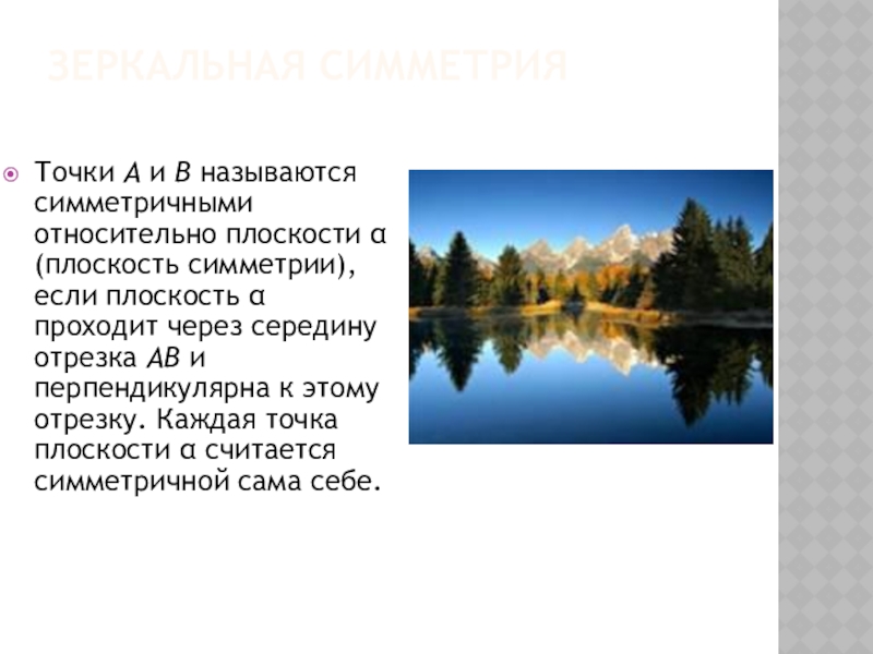 Зеркальная симметрия Точки А и В называются симметричными относительно плоскости α (плоскость симметрии), если плоскость α проходит через середину отрезка АВ и перпендикулярна