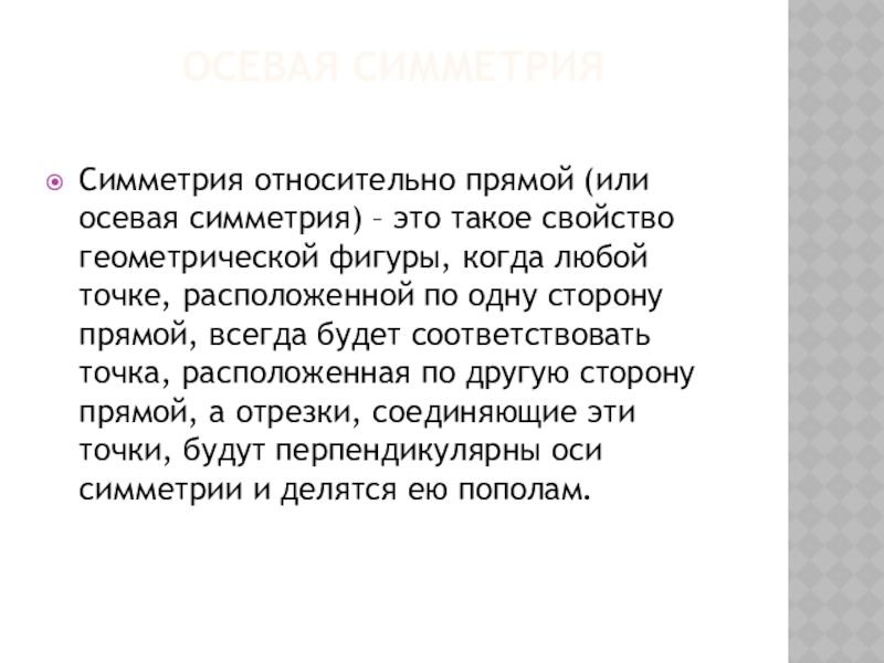 Осевая симметрия Симметрия относительно прямой (или осевая симметрия) – это такое свойство геометрической фигуры, когда любой точке,