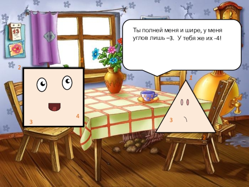 Ты полней меня и шире, у меня углов лишь – 1233.У тебя же их - 4!1234